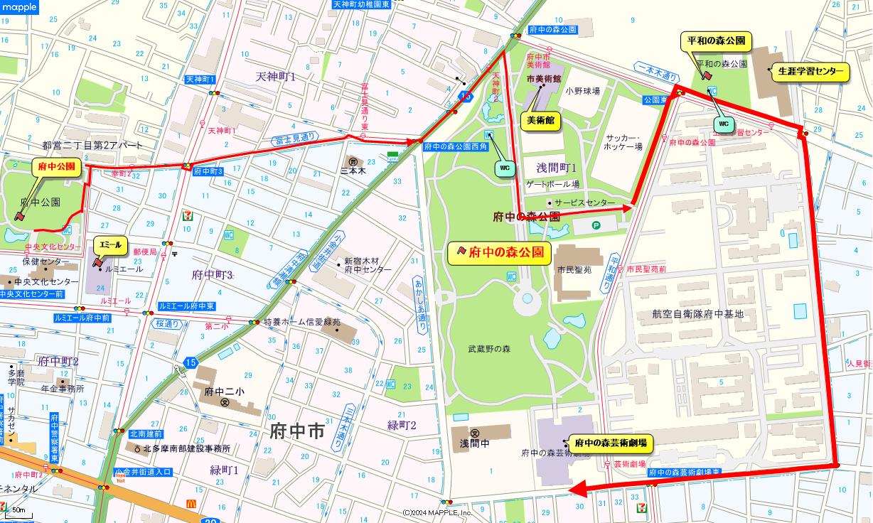 コース 7Km 難易度:普通 府中公園(出発式)⇒東京都木材市場府中センター⇔都立府中の森公園→あかしあ通り公園口~モニュメント噴水~日本庭園~ 花のプロムナード~ゲートボール場(昼食)~府中市美術館(館内短時間見学)⇒平和の森公園(WC)⇒府中市生涯学習センター(WC) ⇒航空自衛隊府中喜一⇒府中の森芸術劇場付近(解散式)⇒東府中駅