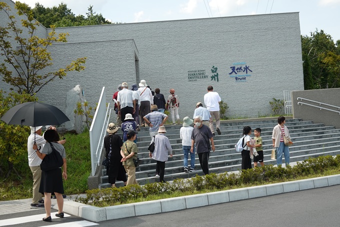 直前3名の欠席者があり57名の参加。8時出発、双葉SAで休息、「三分一湧水」に10時40分到着。緑に囲まれ綺麗な湧水が流れる道は 心癒される。水は非常に冷たかった。新鮮な野菜や土産物がある「道の駅こぶちざわ」で買い物。皆さんトマトや珍しい紫色トウモロコシなど色々買われていた。 「八ヶ岳チーズケーキ工房」で昼食、店内は冷房が効いていて暑いなかでの「ほうとう鍋」おいしく頂いた。「サントリー白洲蒸留所」の白洲の森を歩きサントリー ミュージアムを見学、ミュージアム内はサントリーの製品が並んだ陳列棚や、ウィスキーの樽、サントリーの歴史の紹介などが展示されていた。 セントラルハウスでは、店頭ではなかなか手に入らないウィスキーの「白洲」が一人1本限定で販売されていてかなりの方が購入されていた。 店内には有料で試飲できるコーナーもあり試飲されている方もいた。車窓からは雪の無い富士山、八ヶ岳連峰が望まれたが、甲斐駒は見えなかった。 高原のイメージで涼しいと予想していたが、残念ながら高原の涼しさは味わえなかった。帰途は一部渋滞があったがおおむね順調に進み6時には府中に到着。
