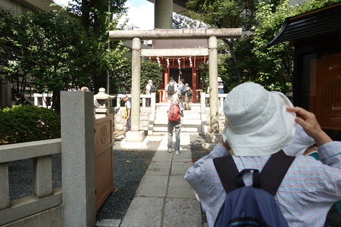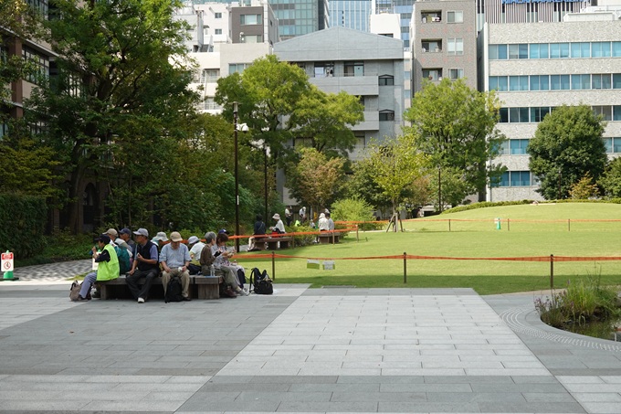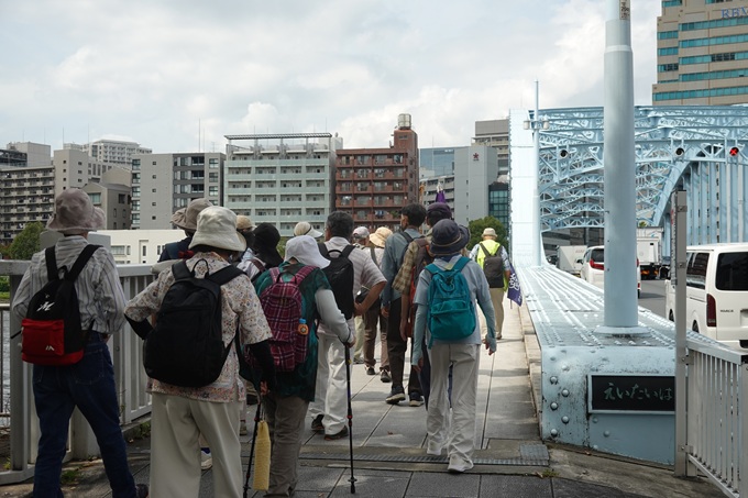 「門前仲町駅」から露店が並ぶ「富岡八幡宮」の参道を通り、隣接する「深川公園」(深川公園は2箇所あり、小さい方) で出発式。門前商店が並ぶ「深川神社」の参道を歩き、(大きい方の)「深川公園」へ。歩道脇に「伊能忠敬住居跡」の道標が ある道を歩き、渋沢栄一の別邸跡に栄一が創業した「渋沢倉庫」の脇に同社の守護神として祀られた「福住稲荷神社」を参拝。 両岸に整備された遊歩道「隅田川テラス」や「隅田川」「スカイツリー」が眺める「永代橋」を渡り、トイレのある小さな公園で休息。 ビルに囲まれた芝生がきれいな「坂元町公園」で昼食、「ござ」が無償で貸し出され寝転ぶこともできる。昼食後、午後のコースで は解散式を行える空き地が無いためここで解散式後午後のコースへ。日曜日で休場の「日本証券取引所」前を通り、「日証館」、 証券界の守り神・商業の神様として信仰を集める「兜神社」を参拝。「日本橋郵便局」脇には近代郵便制度の基礎を作り上げた 郵便発祥の地と刻まれた台座に「前島密」の像がある。「みずほ銀行兜町支店」の壁面には「銀行発祥の地」と刻まれた銘板や 「渋沢栄一」「第一国立」などの説明板が掲げられいて、「渋沢栄一」の功績の一部を知ることができるコースであった。