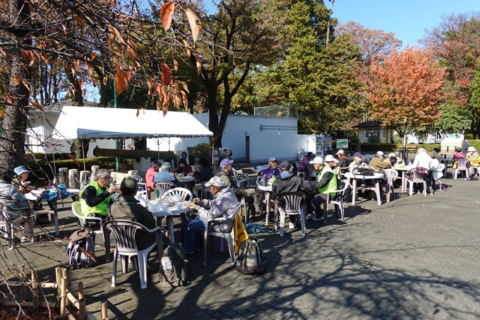 快晴、集合時の気温は10度を下回りやや風があり寒い。出発式で歩行時広がらないように注意があり、今回の例会では 守られていた。 駅前の小金井街道を北に進み、「上水公園」で休息後「玉川上水」の土手を歩き鎌倉時代の建築様式「海岸寺山門」を土手か 眺め、「日比谷公園」の5倍、「上の恩賜公園」の1.5倍の敷地面積は約7万㎡の広大な広さの「都立小金井公園」に入る。 紅葉が見頃の園内を歩き、「東京たてもの園」へ。毎月第三水曜は「シルバーデー」で65歳以上は入園料無料で入園。 園内で昼食後、各自自由に江戸時代から明治、大正、昭和初期の現地保存が不可能な文化的価値の高い歴史的建造物を 移築した30棟の復元した建物等を見学。 日中は朝の風も収まり厚着していた上着を脱いで歩いていた方もいた。