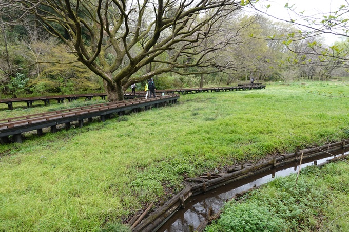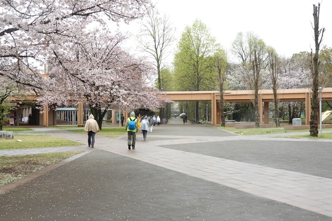 12時頃から雨で夕方から本降りの予報の為か参加者は37名と少なかった。予報より早く出発時点で小雨が降りだし雨具着けて の出発となった。小金井街道を南下し「野川」沿いの遊歩道は、鮮やかな桜並木が続く。 桜を眺めながら「武蔵野公園」から西武線のガードをくぐり「都立野川公園」へ。「野川公園」の「自然観察園」内の木道を歩き 園内を巡り、「東八」道路をまたぐ陸橋を渡り「野川公園」の南側で屋根付きの休息所で昼食。 昼食後「東京外語大」の構内を通り、桜並木の「味の素スタジアム」脇を通り「飛田給駅」へ。 最近の例会では、しばしば最後尾の参加者と先頭とが、かなり離れてしまうことがあり今後の課題。