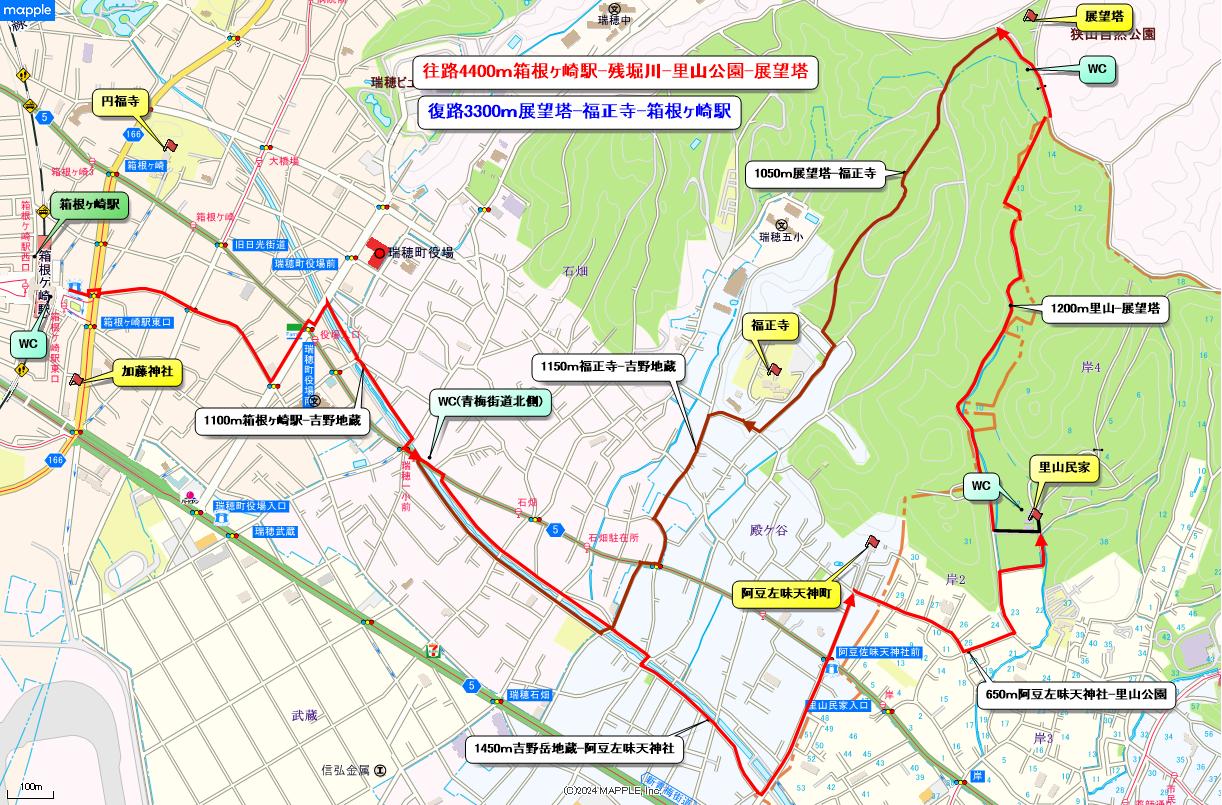 コース 7.8Km 難易度:健脚 箱根ヶ崎駅(WC)⇒残堀川⇒(1100m)⇒吉野岳地蔵(WC)⇒残堀川⇒(1450m)⇒阿豆左味天神社 ⇒(650m)⇒里山民家(WC)⇒岸たんぼ⇒(1200m)⇒文化の森⇒展望塔(昼食/WC)⇒(1100m)⇒ 福正寺⇒残堀川⇒(1200m)⇒吉野岳地蔵(WC)⇒残堀川⇒(1100m)⇒箱根ヶ崎駅