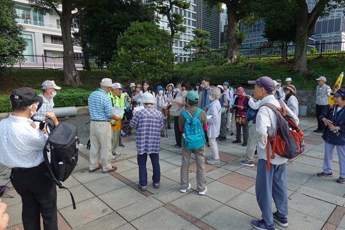「門前仲町駅」から露店が並ぶ「富岡八幡宮」の参道を通り、隣接する「深川公園」(深川公園は2箇所あり、小さい方) で出発式。門前商店が並ぶ「深川神社」の参道を歩き、(大きい方の)「深川公園」へ。歩道脇に「伊能忠敬住居跡」の道標が ある道を歩き、渋沢栄一の別邸跡に栄一が創業した「渋沢倉庫」の脇に同社の守護神として祀られた「福住稲荷神社」を参拝。 両岸に整備された遊歩道「隅田川テラス」や「隅田川」「スカイツリー」が眺める「永代橋」を渡り、トイレのある小さな公園で休息。 ビルに囲まれた芝生がきれいな「坂元町公園」で昼食、「ござ」が無償で貸し出され寝転ぶこともできる。昼食後、午後のコースで は解散式を行える空き地が無いためここで解散式後午後のコースへ。日曜日で休場の「日本証券取引所」前を通り、「日証館」、 証券界の守り神・商業の神様として信仰を集める「兜神社」を参拝。「日本橋郵便局」脇には近代郵便制度の基礎を作り上げた 郵便発祥の地と刻まれた台座に「前島密」の像がある。「みずほ銀行兜町支店」の壁面には「銀行発祥の地」と刻まれた銘板や 「渋沢栄一」「第一国立」などの説明板が掲げられいて、「渋沢栄一」の功績の一部を知ることができるコースであった。