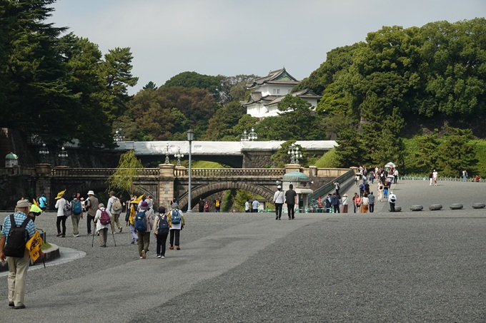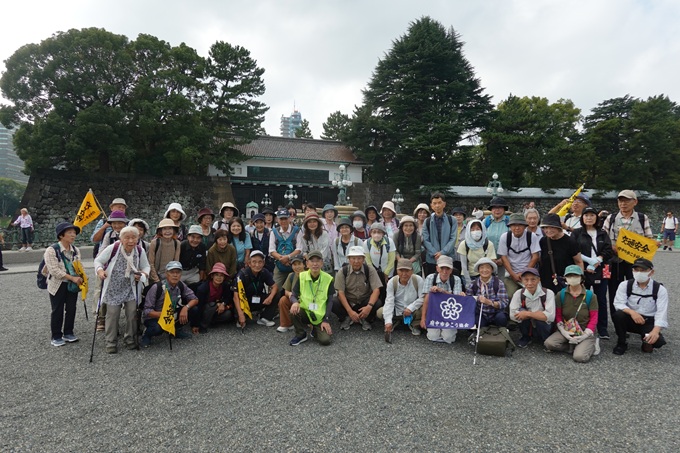 東京駅丸の内口を出るとレンガ造りの「東京駅」の正面に出る。広い「行幸通り」を真直ぐ行き「和田倉噴水公園」で「出発式」。 緑の芝と松に囲まれた「皇居外苑」を歩き「楠木正成像」前へ。皇居外苑側から「桜田門」の1つ目の門をを潜り「内堀通り」に面した門を抜けると 正面に「警視庁」やレンガ造りの「最高裁判所」少し離れて「国会議事堂」が望めた。「桜田門」からきた道を戻るように「皇居外苑」を「大手門」方向に 歩き、「二重橋」を望み、「大手門」脇の広場で参加者の集合写真を撮り、「大手門」から手荷物検査を経て「皇居東御苑」に入る。 「同心番所」や「百人番所」の木造の建物、所々道の両側に江戸城の名残の大きな石垣のある砂利道を歩き、坂道を登り「富士見櫓」へ。 石垣だけが残る「江戸城天守閣跡」の石垣の上からの眺望はビルに囲まれ見通せない。「旧本丸跡」の芝生で昼食。昼食後、都道府県の木が植えられた 「二の丸庭園」を通り「大手門」から「東御苑」を出て「和田倉噴水公園」で解散式。東京駅や皇居外苑、東御苑も外国の方が大勢で 日本の方が少なく感じた。今回は「東御苑」を時間を掛けで周り、会員の方から「こんなに詳しく見たことがなかった、よかった」との声が聞かれた。