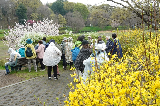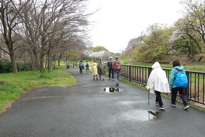 12時頃から雨で夕方から本降りの予報の為か参加者は37名と少なかった。予報より早く出発時点で小雨が降りだし雨具着けて の出発となった。小金井街道を南下し「野川」沿いの遊歩道は、鮮やかな桜並木が続く。 桜を眺めながら「武蔵野公園」から西武線のガードをくぐり「都立野川公園」へ。「野川公園」の「自然観察園」内の木道を歩き 園内を巡り、「東八」道路をまたぐ陸橋を渡り「野川公園」の南側で屋根付きの休息所で昼食。 昼食後「東京外語大」の構内を通り、桜並木の「味の素スタジアム」脇を通り「飛田給駅」へ。 最近の例会では、しばしば最後尾の参加者と先頭とが、かなり離れてしまうことがあり今後の課題。