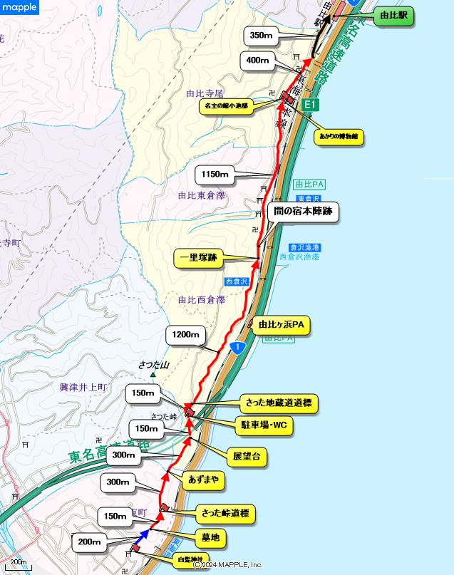 江戸時代の旧東海道由比宿と興津宿の間に位置する標高93メートルの峠で昔 から富士山を望む絶景の景勝地として 知られており、歌川広重の浮世絵「東海道五十三次・由比」でも有名。 晴れていれば富士山や伊豆半島、手前を走る東名高速道路、国道1号線、それに、東海道本線などの構造物を一望にできる 絶景ポイント。峠の出口から由比駅の道沿いには、くぐり戸、格子づくりなどの旧家が見られます。 *薩埵(さった)峠のコース概要* 白髪神社駐車場からの峠越えになり歩行距離は約4Kmで白髪神社駐車場から墓地まで200mは上り坂墓地から薩埵峠道票 まで約150mは急な階段です。 薩埵峠道票まで登ればあとはほぼ平坦か下り坂になります。 薩埵峠道票からは先のコースは前面に富士山や眼下に駿河湾を眺めながらになります。